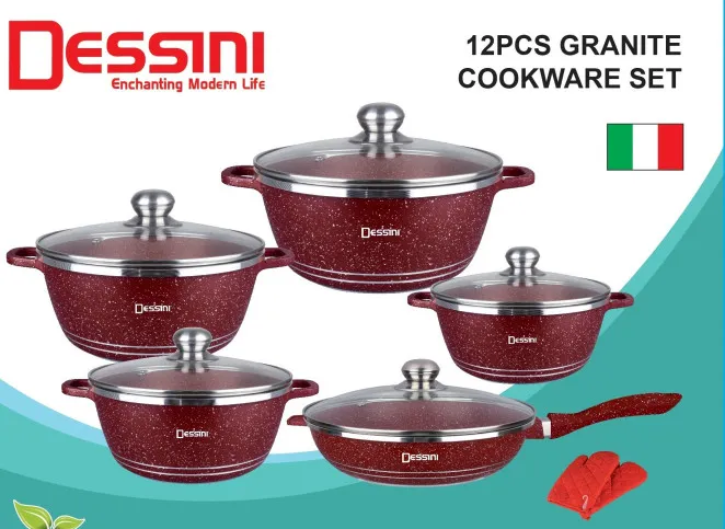 طقم جرانيت 12 قطعة غير لاصق، جرانيت دائرى بغطاء زجاجى بقاعدة ألومنيوم، ماركة Dessini Italy ايطالى المنشاء